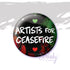 - "Artists For Ceasefire" on a boldly painted background of black, greens, and reds