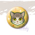 A cute little kitty face on a button pin! This cat has a brownish-grey tabby pattern and yellow eyes.