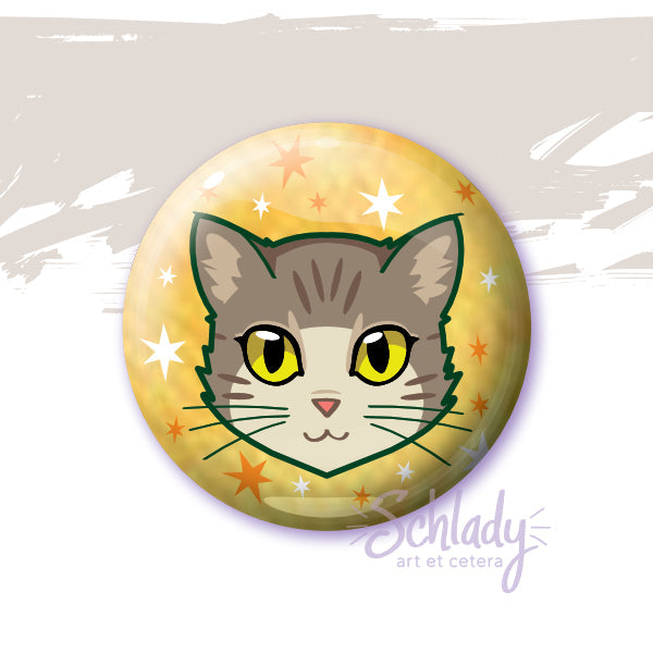 A cute little kitty face on a magnet! This cat has a brownish-grey tabby pattern and yellow eyes.