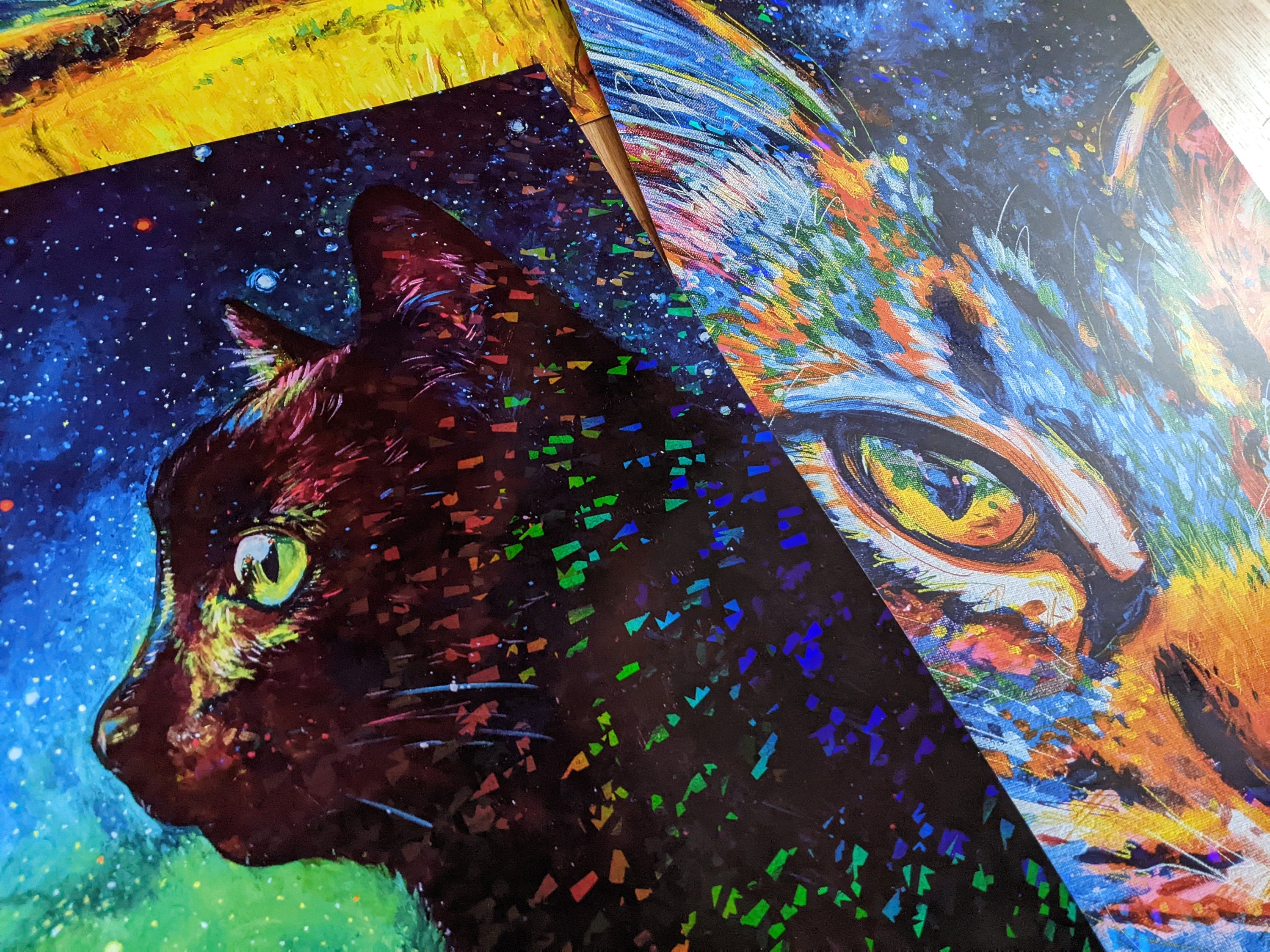 This colorful cat artwork is professionally printed on heavy cardstock with a subtle holographic shatter finish that shimmers & sparkles under bright light. Each print is signed by the artist. The image extends all the way to the edge of the 11x17 paper as shown, ideal for use in many styles of home decor. Each print comes unframed and unmatted, packaged in a clear bag for protection. Please keep in mind actual colors may vary slightly from images shown online.