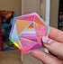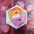 A subtle yet nerdy way to flaunt your pride! This geometric pattern is based off our favorite 20-sided dice, decorated with the beautiful painted colors of the lesbian pride flag.