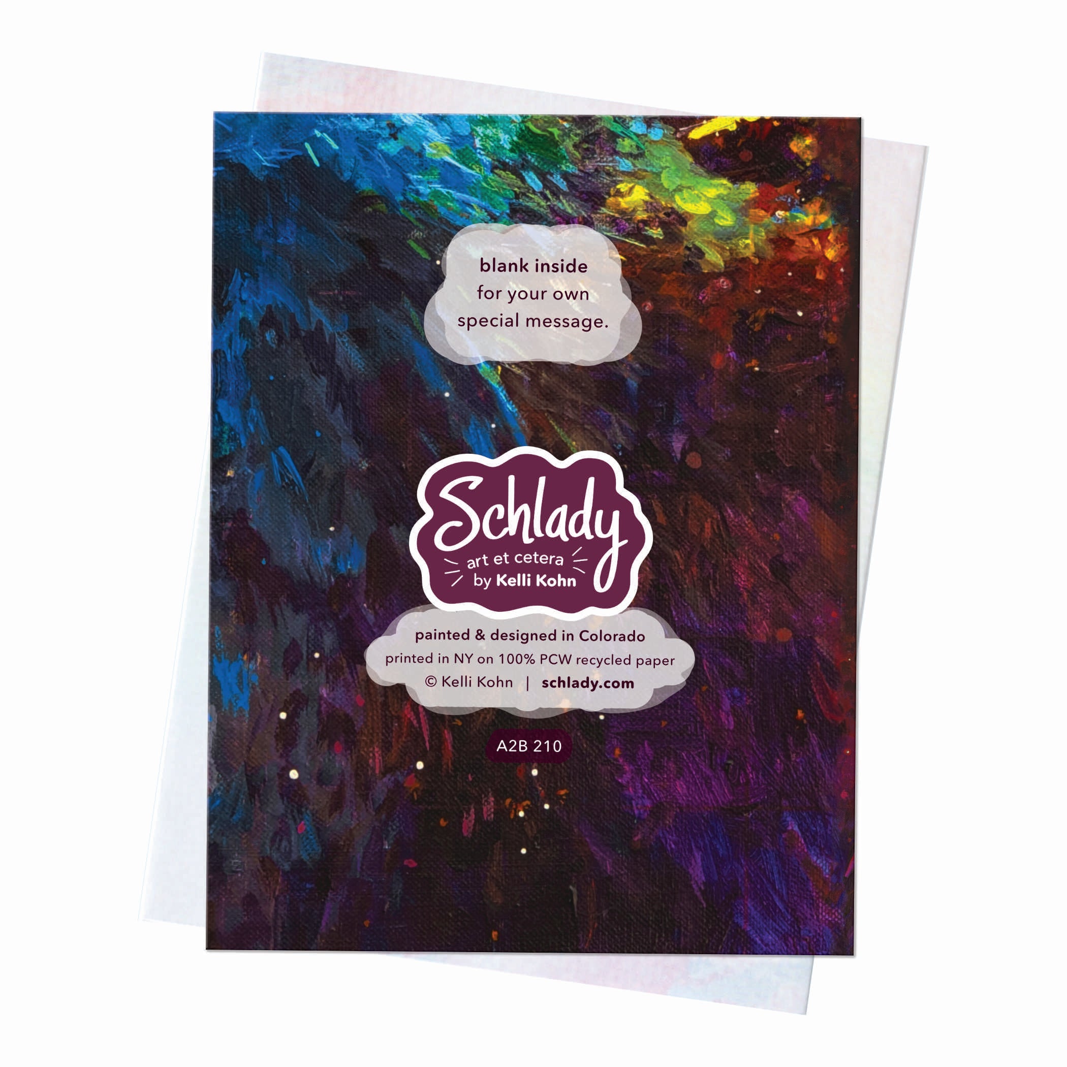 This A2 4.25" x 5.5" notecard was 100% painted & designed by yours truly in Colorado, and printed in the USA on heavy cardstock made with 100% PCW recycled paper. The smooth matte exterior brings out the rich colors of the artwork - suitable for framing as a mini print! The inside of the card has a smooth non-glossy writing surface for your own special message, lightly decorated with details from the featured image.
