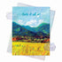 A greeted birthday card featuring blue mountains, green foliage, and red rocks standing tall behind a golden field in Red Rock Canyon Open Space park in Colorado Springs. The image is from the acrylic painting on canvas "Open Space" by artist Kelli Kohn. (hey, that's me!)