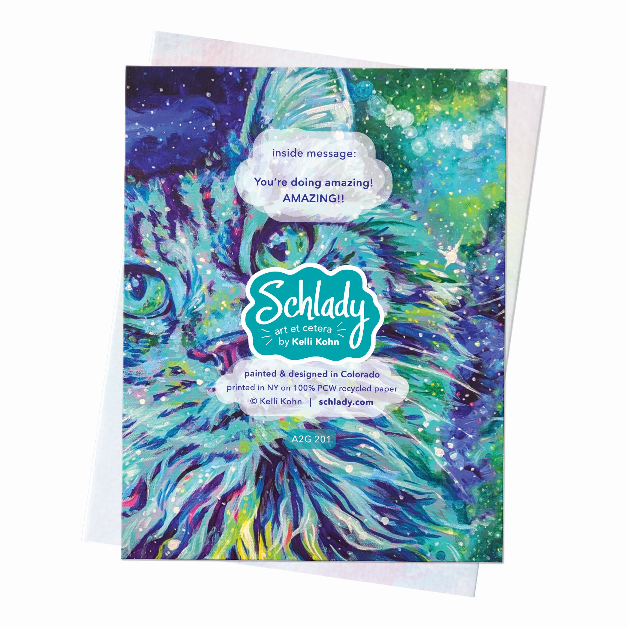 A greeted congratulations card featuring a wise feline being that floats between stars and sea. The cat image is from the acrylic painting on canvas "Star of the Galax-Sea" by artist Kelli Kohn. (hey, that's me!)