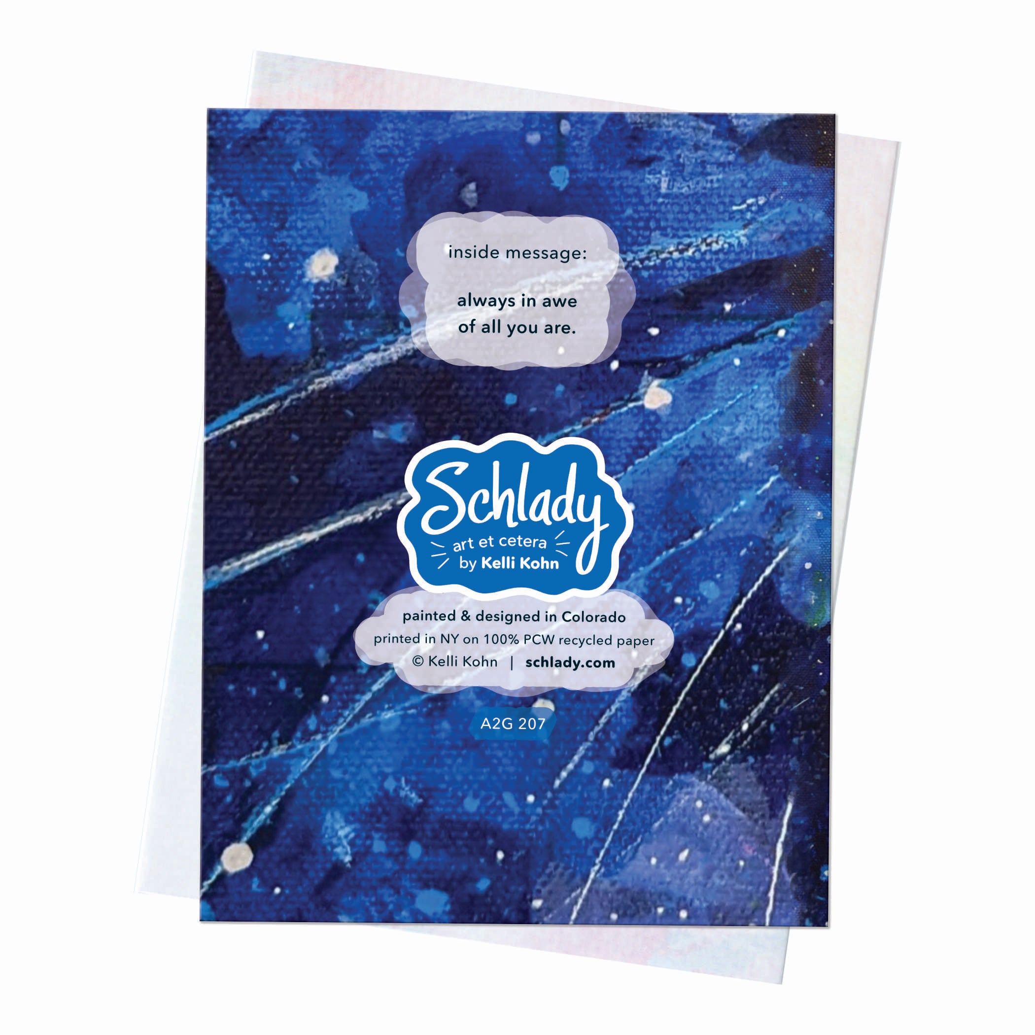 A greeting card suitable for many occasions such as birthdays, congratulations, thinking of you, friendship, love, and more - featuring a bright-eyed white cat melting into a blue cloud of stars. The image is from the acrylic painting on canvas "Galaxy Cloud" by artist Kelli Kohn. (hey, that's me!)